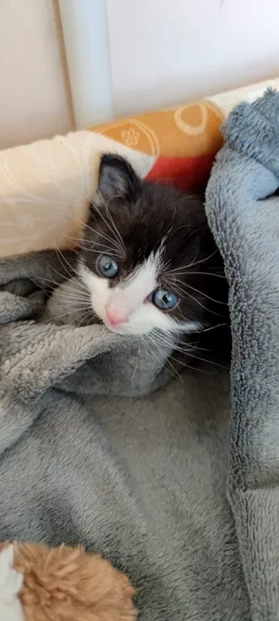 FOTO | Operațiunea „Salvați pisicuța!”. Cine a adoptat micuța felină cu ochi albaștri după ce a fost salvată de pompieri