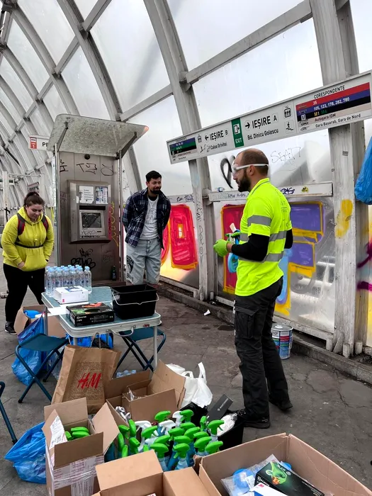 FOTO | Pasajul Basarab, plin de murdărie și graffiti, curățat de voluntari. A fost igienizată inclusiv stația STB de tramvai