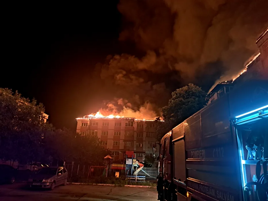 FOTO ȘI VIDEO| Bloc cuprins de flăcări și INTERVENȚIE în forță a pompierilor. Sute de persoane au fost evacuate în miez de noapte