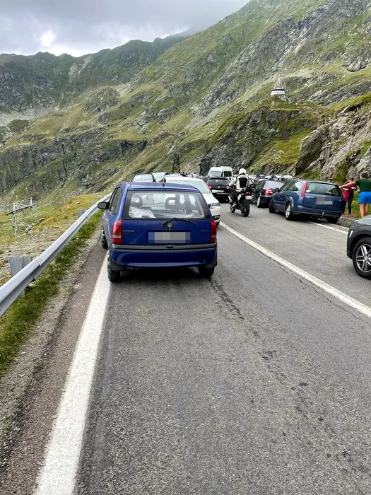 FOTO. Trafic de coșmar pe Transfăgărăşan. Turiştii au parcat pe carosabil şi au blocat drumul. Poliția anunță amenzi într-un mesaj ironic: „Pentru responsabilitate și decență veți fi premiați!”
