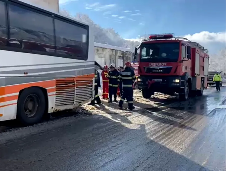 FOTO | Incendiu la un autocar în care se aflau 25 de copii și 13 adulți, în județul Maramureș