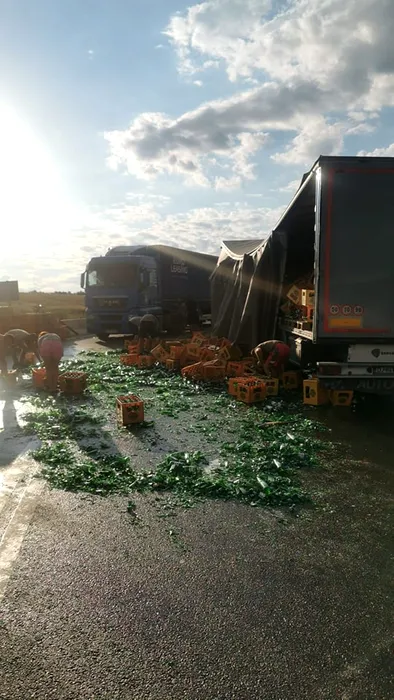 FOTO | Un camion plin cu sticle de bere s-a răsturnat pe DN65, în judeţul Olt. Reacția genială a unui internaut