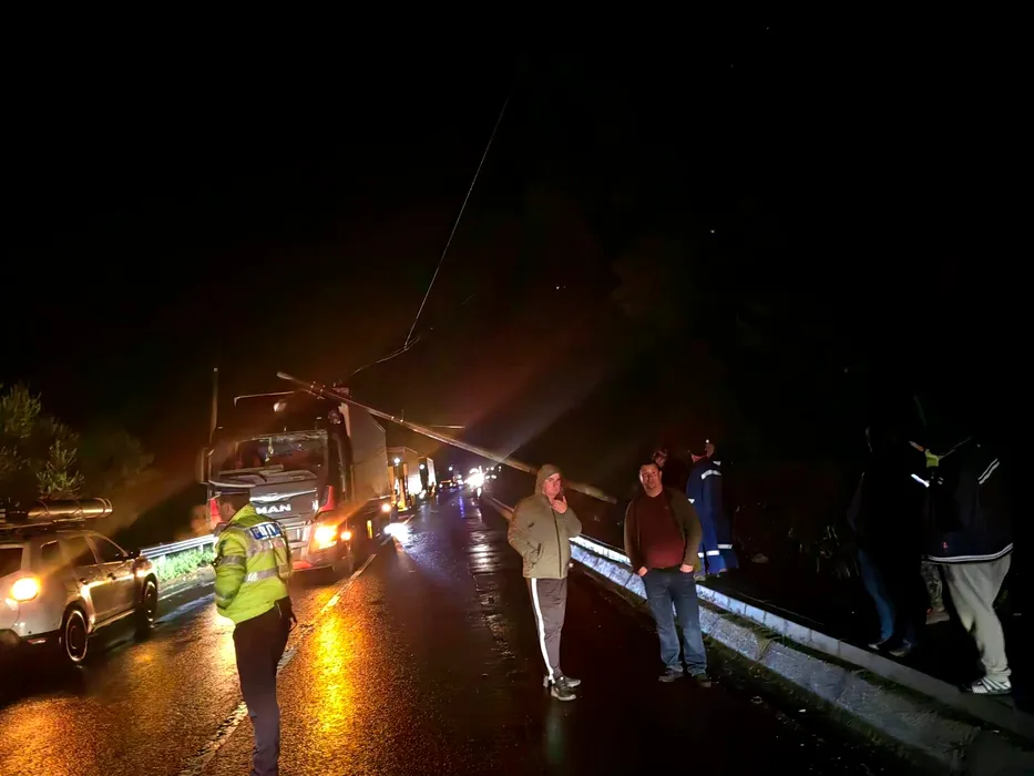 FOTO | Un stâlp de electricitate a căzut pe un autocamion în județul Harghita. Nu au fost înregistrate victime