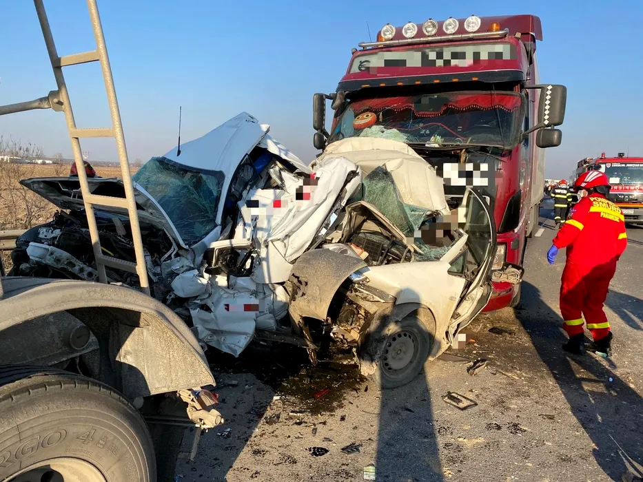 FOTO – VIDEO – Carnagiu pe A1. Două mașini au fost strivite de o cisternă și un tir. Șoferii celor două autoturisme au murit