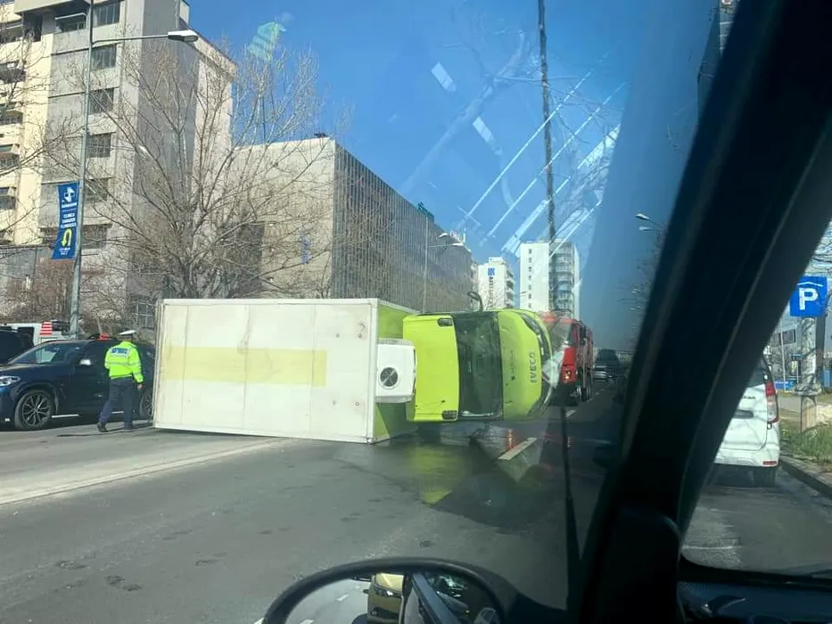 GALERIE FOTO: FOTO – VIDEO | Accident în Capitală. Un camion s-a răsturnat pe Calea Floreasca. O persoană a fost rănită