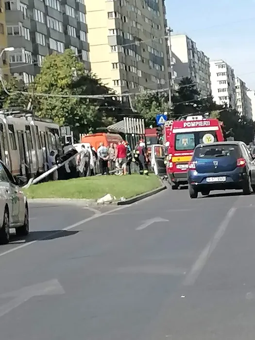 FOTO – VIDEO – Accident în Capitală: O mașină a fost acroșată de un tramvai și a ajuns pe refugiul pentru pietoni