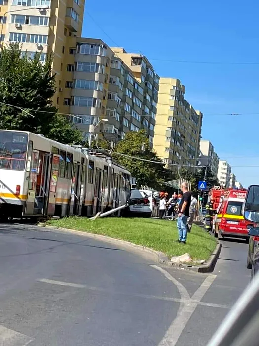 FOTO – VIDEO – Accident în Capitală: O mașină a fost acroșată de un tramvai și a ajuns pe refugiul pentru pietoni