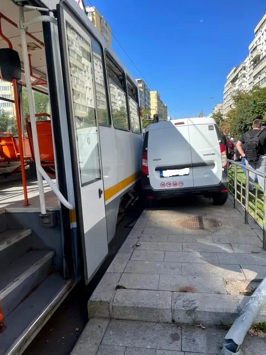 FOTO – VIDEO – Accident în Capitală: O mașină a fost acroșată de un tramvai și a ajuns pe refugiul pentru pietoni