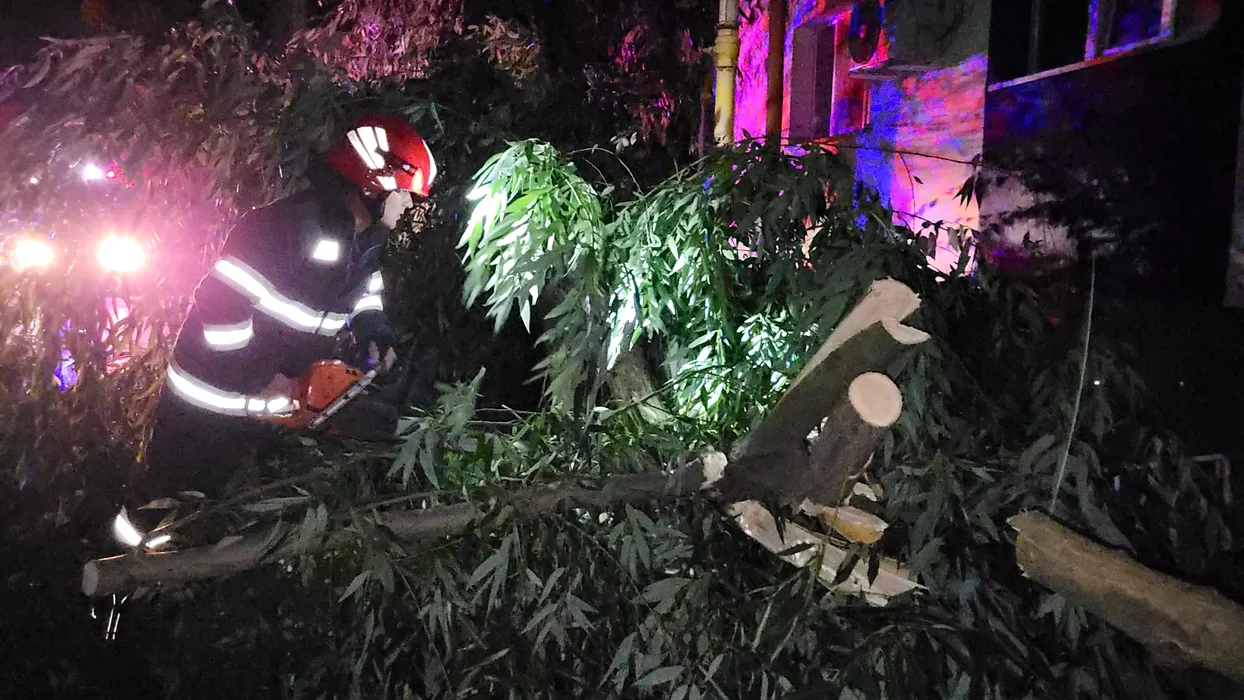FOTO-VIDEO. Autoturisme distruse de furtună, în Giurgiu. Copacii și panourile publicitare s-au prăbușit din cauza vijeliei