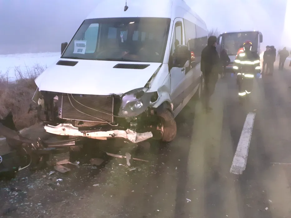 FOTO-VIDEO | Doi copii și un adult au ajuns la spital, după ce un microbuz școlar s-a ciocnit cu o mașină