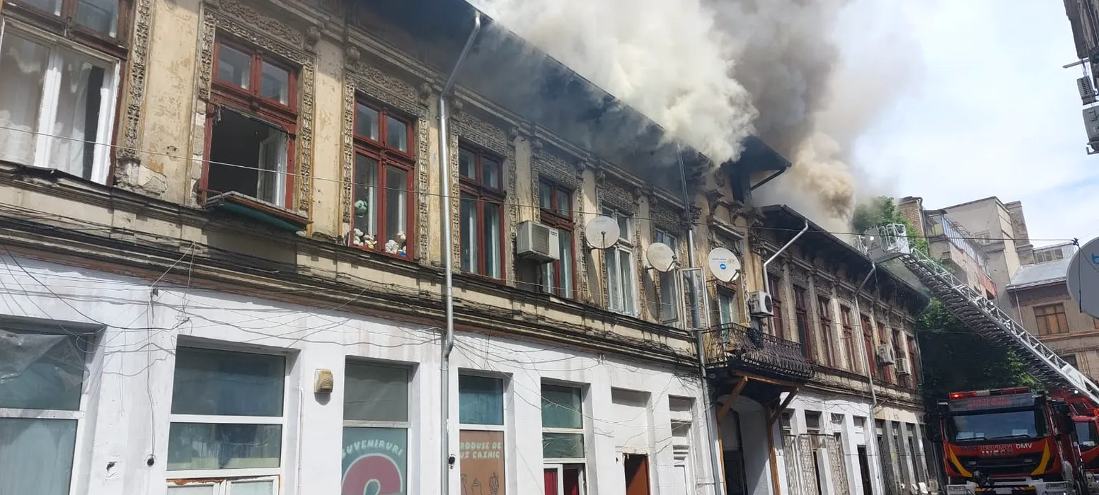 FOTO-VIDEO | Incendiu violent la o casă din centrul Capitalei. Un bărbat imobilizat la pat a fost evacuat