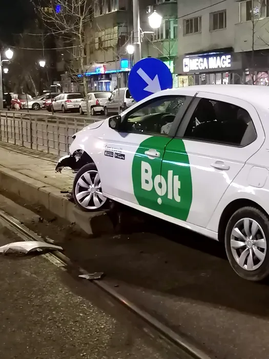 FOTO-VIDEO | Un șofer de la Bolt a pierdut controlul mașinii și a intrat într-un refugiu de tramvai. El și cei doi clienți au ajuns la spital