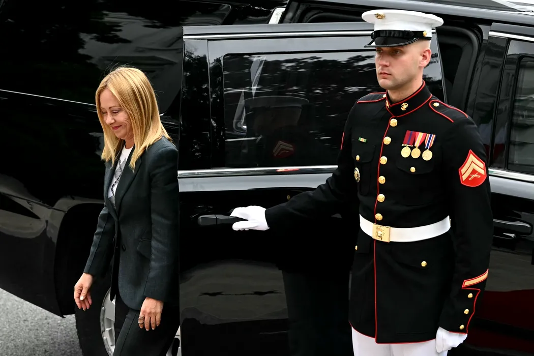 Italian Prime Minister Giorgia Meloni arrives at the White House South Portico in Washington, DC, on August 18, 2025. European leaders join Ukrainian President Volodymyr Zelensky in talks with US President Donald Trump on August 18, as they try to find a way to end Russia's offensive. The leaders heading to Washington on Monday to appear alongside Zelensky call themselves the "coalition of the willing.",Image: 1030129448, License: Rights-managed, Restrictions: , Model Release: no
