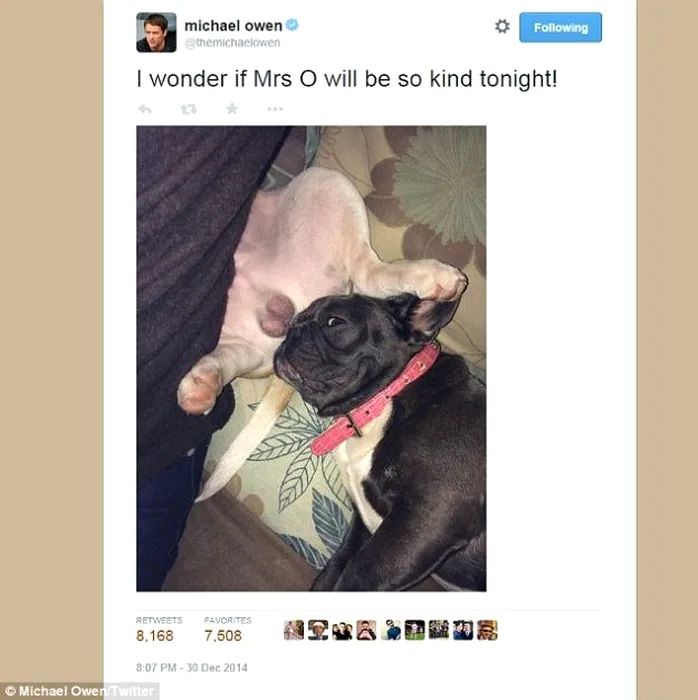 Fotografia trimisă de Michael Owen soției sale. „Mă întreb dacă doamna O. va fi la fel de binevoitoare diseară”