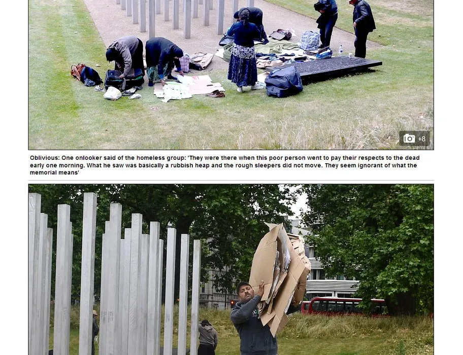 Fotografiile vorbesc de la sine. Mai mulți imigranți fără adăpost și-au instalat tabăra lângă un monument din Londra, dedicat victimelor atentatelor din 2005
