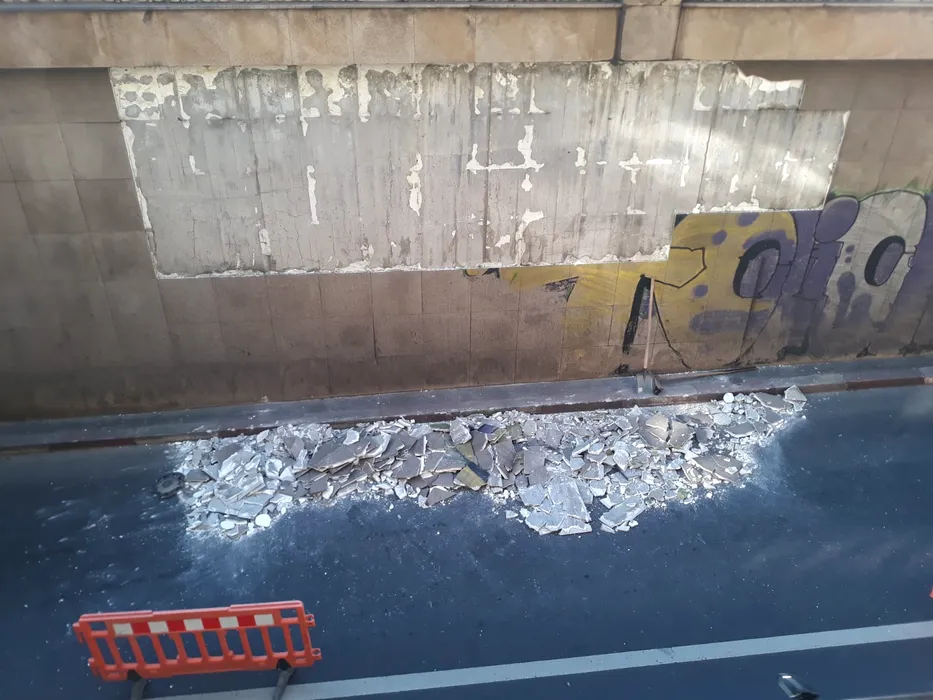 FOTO&VIDEO| Plăcile de piatră de pe pereții Pasajului Unirii s-au desprins și au căzut pe carosabil. Traficul rutier a fost restricționat
