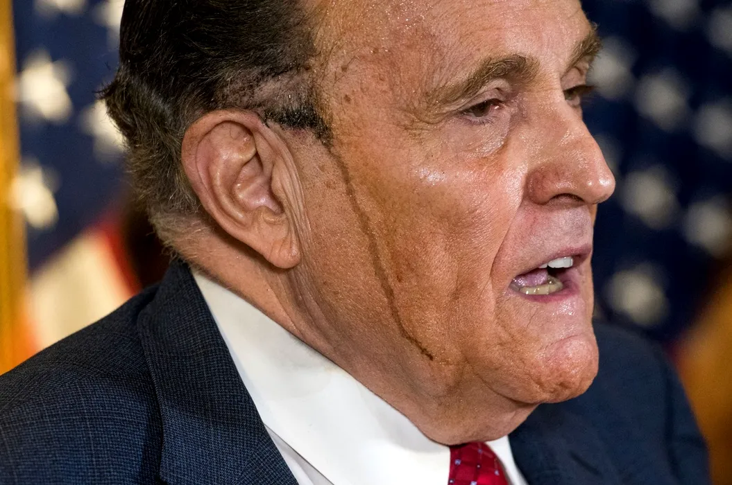 Freza lui Giuliani îi joacă feste în timpul unei conferințe de presă: Avocatul lui Trump transpiră atât de mult încât i se scurge pe față vopseaua de păr! / Sursă FOTO: Profimedia Images