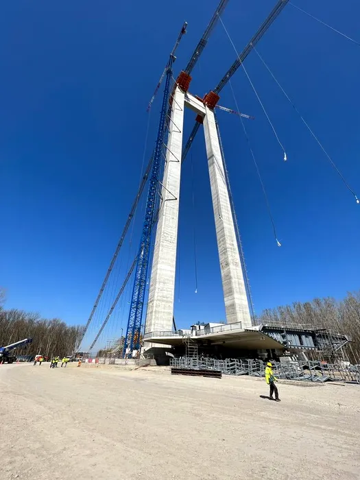 GALERIE FOTO | Cel mai mare pod din România și al treilea din Europa prinde contur. S-a montat un nou segment de tablier la „Golden Gate” de Brăila