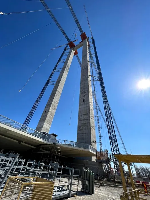 GALERIE FOTO | Cel mai mare pod din România și al treilea din Europa prinde contur. S-a montat un nou segment de tablier la „Golden Gate” de Brăila
