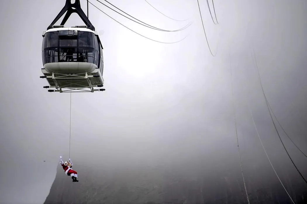 Un bărbat îmbrăcat ca Moș Crăciun suspendat de o telecabină flutură la vizitatori la sosirea pe muntele Sugar Loaf. Rio de Janeiro, Brazilia. 05 decembrie 2020