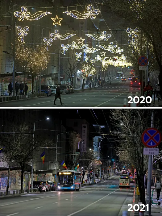 GALERIE FOTO | Dacă în 2020 aveam un oraș împodobit, anul acesta a dispărut atmosfera de sărbătoare. Luminițele din București din acest an, în comparație cu anul trecut