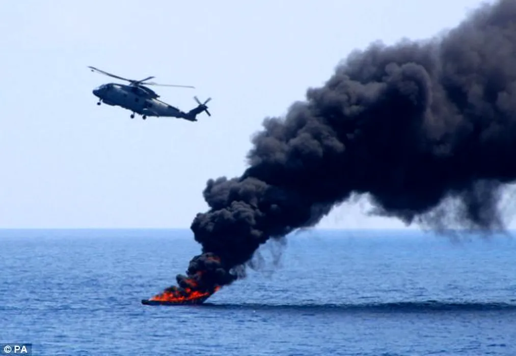 GALERIE FOTO. Demonstrație de forță în largul Somaliei. O barcă de pirați somalezi a fost aruncată în aer de un elicopter britanic