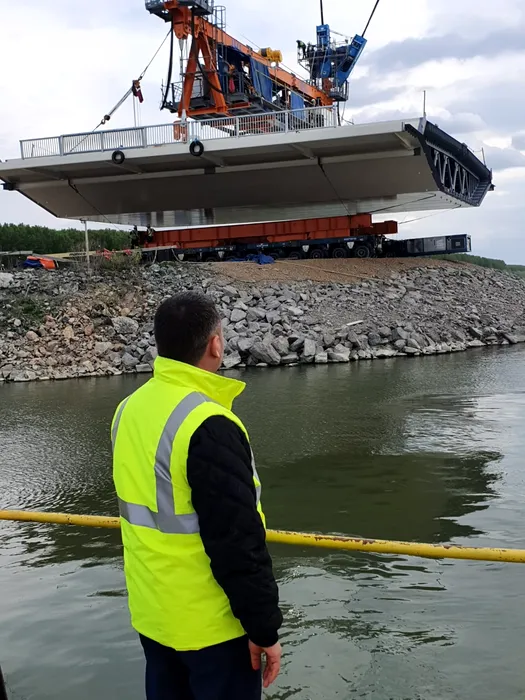 GALERIE FOTO | Imagini spectaculoase cu cel mai mare pod din România și al treilea din Europa. Cum se montează tablierul la „Golden Gate” de Brăila