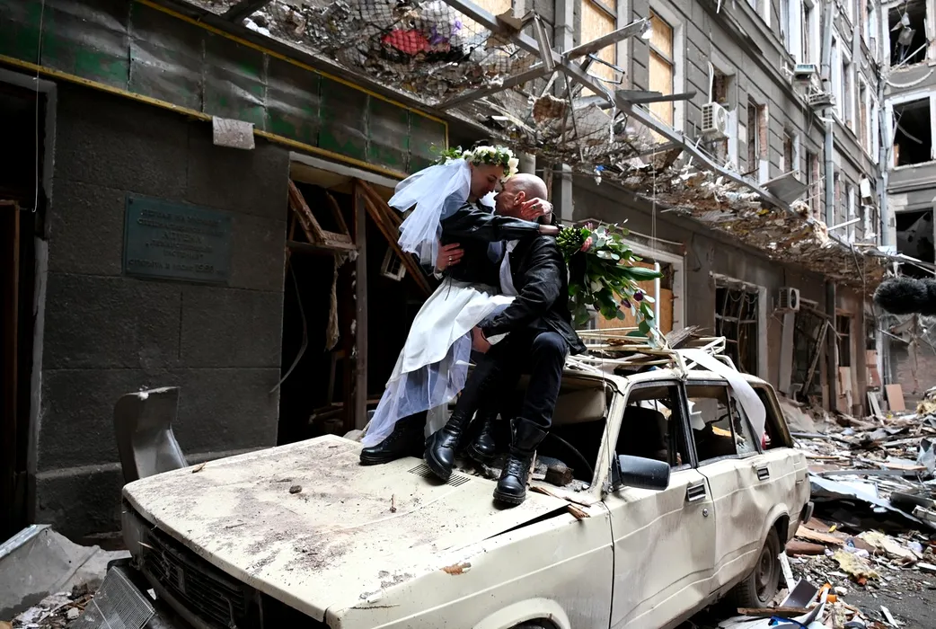 GALERIE FOTO | Un medic și o asistentă s-au căsătorit în Harkov. Imaginile cu cei doi printre ruinele orașului distrus de război s-au viralizat