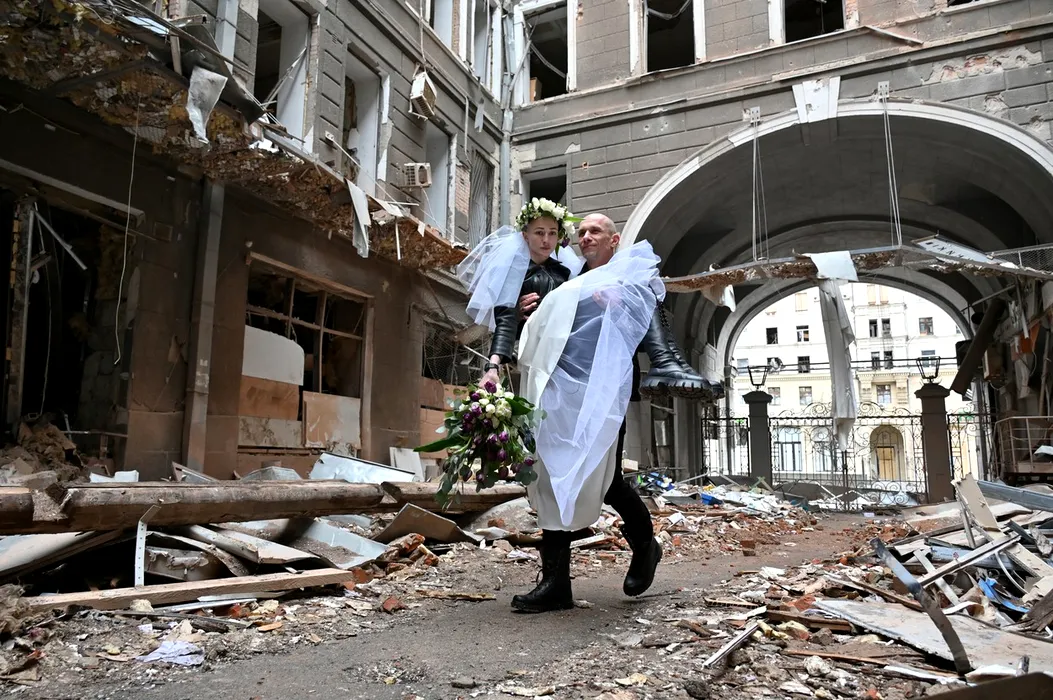 GALERIE FOTO | Un medic și o asistentă s-au căsătorit în Harkov. Imaginile cu cei doi printre ruinele orașului distrus de război s-au viralizat