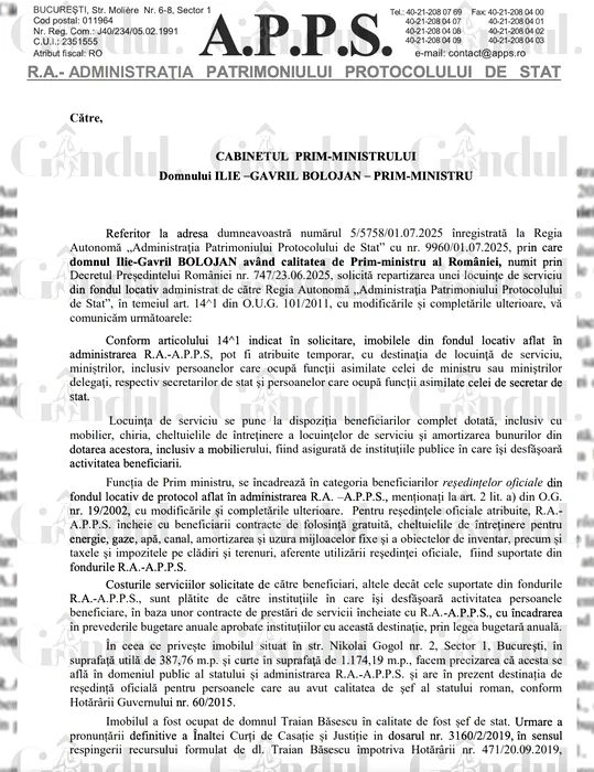 Gândul a avut dreptate! Publicăm în exclusivitate DOCUMENTUL care atestă că Bolojan a stat ABUZIV în imobilul din strada Gogol. RA-APPS l-a informat pe Bolojan că nu are dreptul să stea acolo, dar NU a ținut cont