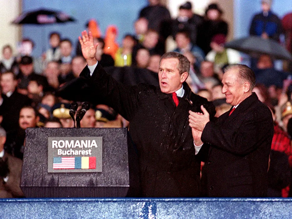 23 Noiembrie 2002. Presedintele american George W. Bush a sosit, la ora 16.15, in Piata Revolutiei, unde se pregateste sa tina un discurs public.