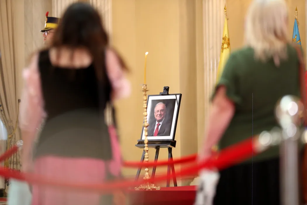 Persoane prezinta un ultim omagiu in fata tabloului cu portretul fostului presedinte Ion Iliescu, in Sala Unirii a Palatului Cotroceni, miercuri, 6 august 2025. Mihai Pop / GMN / MEDIAFAX FOTO