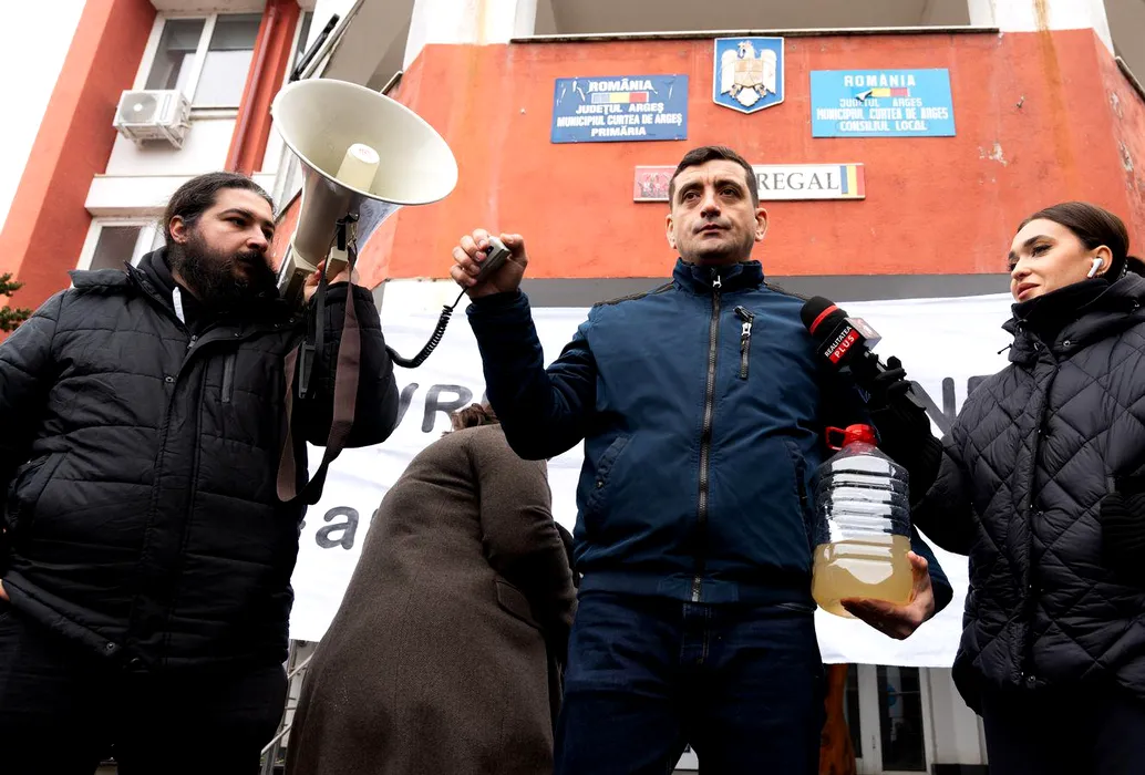George Simion protestează la Curtea de Argeș alături de localnicii care nu au apă potabilă de patru luni: „Bolojan o ține în brațe pe Buzoianu”