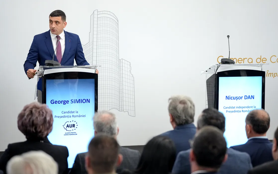 Candidatul prezidential George Simion participa la o dezbatere organizata de Camera de Comert si Industrie a Romaniei, marti, 13 mai 2025, in Bucuresti. ANDREEA ALEXANDRU / MEDIAFAX FOTO
