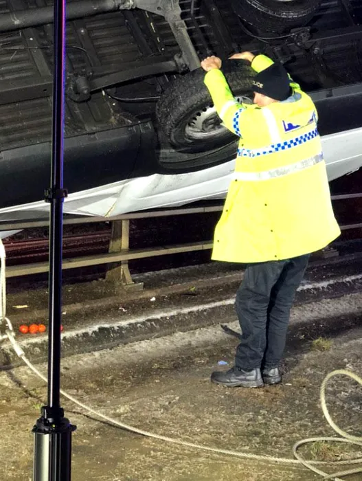 Gest incredibil al unui polițist britanic: a ținut cu forța o autoutilitară care era să cadă de pe un pod. Șoferul era prins înăuntru. GALERIE FOTO