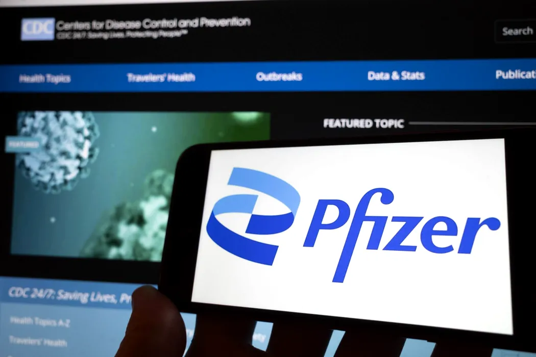 August 29, 2023, New York, New York, United States: Pfizer ($PFE) logo in front of a CDC website page on COVID-19..Pfizer, a leading pharmaceutical company established in 1849, focuses on diverse healthcare industry pharmaceuticals and narcotics. In 2020, it launched a COVID-19 vaccine collaboration with BioNTech under CEO Albert Bourla and is known as a ''Big Pharma'' company...Critics have accused the COVID-19 vaccine of causing complications such as myocarditis in young male patients in the VARES system. (Credit Image: © Taidgh Barron/ZUMA Press Wire)