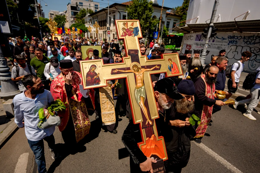 Gigi Becali tine o cruce in timpul unei contramanifestatii organizate de asociatia ''Fratia Ortodoxa'' fata de marsul comunitatii LGBTQ+ ''Bucharest Pride 2025ÕÕ, in Bucuresti, duminica, 8 iunie 2025. Aproximativ 100 de persoane purtand cruci, icoane si agheasma au participat, duminica, la un mars de ''izgonire a duhurilor necurate lasate in urma de parada LGBTQ'' conform organizatorilor, pe acelasi traseu ca participantii la Bucharest Pride 2025. ANDREEA ALEXANDRU / MEDIAFAX FOTO