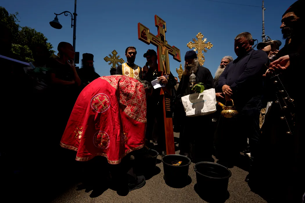 Gigi Becali tine o cruce in timpul unei contramanifestatii organizate de asociatia ''Fratia Ortodoxa'' fata de marsul comunitatii LGBTQ+ ''Bucharest Pride 2025ÕÕ, in Bucuresti, duminica, 8 iunie 2025. Aproximativ 100 de persoane purtand cruci, icoane si agheasma au participat, duminica, la un mars de ''izgonire a duhurilor necurate lasate in urma de parada LGBTQ'' conform organizatorilor, pe acelasi traseu ca participantii la Bucharest Pride 2025. ANDREEA ALEXANDRU / MEDIAFAX FOTO