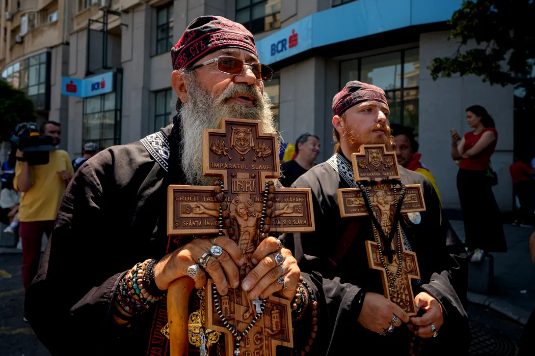Doi barbati tin in maini cruci, in timpul unei contramanifestatii organizate de asociatia ''Fratia Ortodoxa'' fata de marsul comunitatii LGBTQ+ ''Bucharest Pride 2025ÕÕ, in Bucuresti, duminica, 8 iunie 2025. Aproximativ 100 de persoane purtand cruci, icoane si agheasma au participat, duminica, la un mars de ''izgonire a duhurilor necurate lasate in urma de parada LGBTQ'' conform organizatorilor, pe acelasi traseu ca participantii la Bucharest Pride 2025. ANDREEA ALEXANDRU / MEDIAFAX FOTO