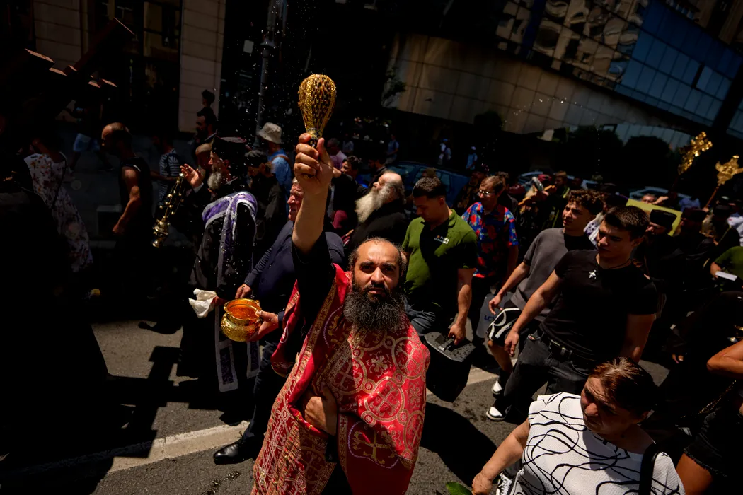 Un preot sfintireste cu agheasma in timpul unei contramanifestatii organizate de asociatia ''Fratia Ortodoxa'' fata de marsul comunitatii LGBTQ+ ''Bucharest Pride 2025ÕÕ, in Bucuresti, duminica, 8 iunie 2025. Aproximativ 100 de persoane purtand cruci, icoane si agheasma au participat, duminica, la un mars de ''izgonire a duhurilor necurate lasate in urma de parada LGBTQ'' conform organizatorilor, pe acelasi traseu ca participantii la Bucharest Pride 2025. ANDREEA ALEXANDRU / MEDIAFAX FOTO