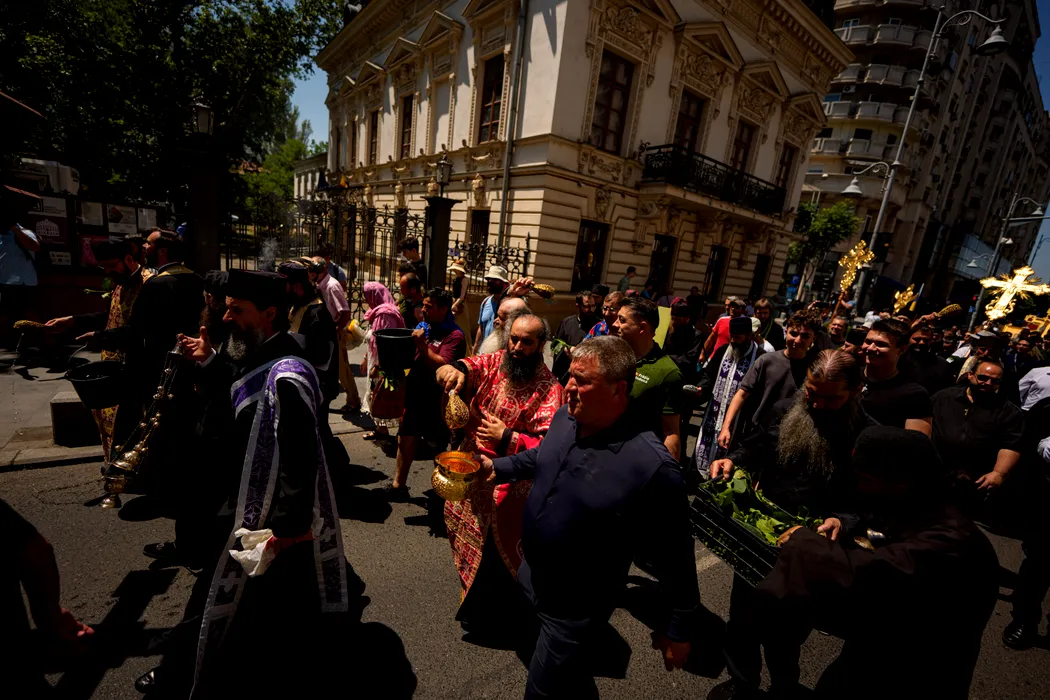 Un preot sfintireste cu agheasma in timpul unei contramanifestatii organizate de asociatia ''Fratia Ortodoxa'' fata de marsul comunitatii LGBTQ+ ''Bucharest Pride 2025ÕÕ, in Bucuresti, duminica, 8 iunie 2025. Aproximativ 100 de persoane purtand cruci, icoane si agheasma au participat, duminica, la un mars de ''izgonire a duhurilor necurate lasate in urma de parada LGBTQ'' conform organizatorilor, pe acelasi traseu ca participantii la Bucharest Pride 2025. ANDREEA ALEXANDRU / MEDIAFAX FOTO