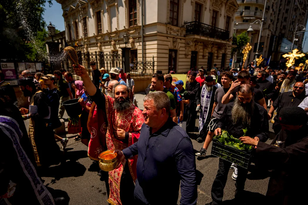 Un preot sfintireste cu agheasma in timpul unei contramanifestatii organizate de asociatia ''Fratia Ortodoxa'' fata de marsul comunitatii LGBTQ+ ''Bucharest Pride 2025ÕÕ, in Bucuresti, duminica, 8 iunie 2025. Aproximativ 100 de persoane purtand cruci, icoane si agheasma au participat, duminica, la un mars de ''izgonire a duhurilor necurate lasate in urma de parada LGBTQ'' conform organizatorilor, pe acelasi traseu ca participantii la Bucharest Pride 2025. ANDREEA ALEXANDRU / MEDIAFAX FOTO