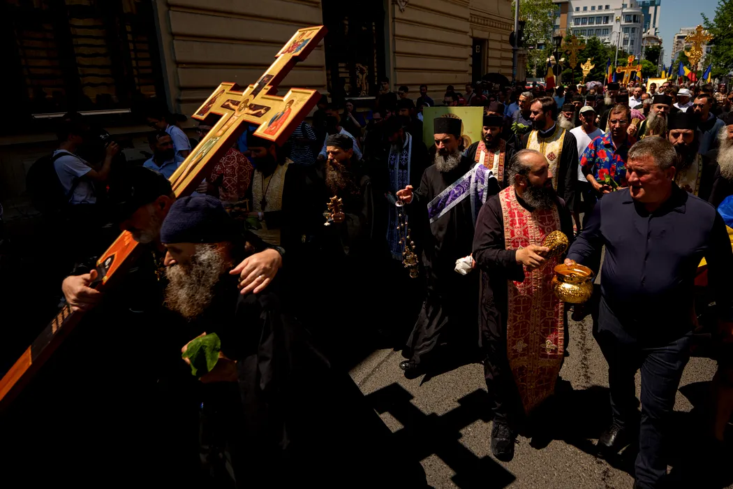 Gigi Becali tine o cruce in timpul unei contramanifestatii organizate de asociatia ''Fratia Ortodoxa'' fata de marsul comunitatii LGBTQ+ ''Bucharest Pride 2025ÕÕ, in Bucuresti, duminica, 8 iunie 2025. Aproximativ 100 de persoane purtand cruci, icoane si agheasma au participat, duminica, la un mars de ''izgonire a duhurilor necurate lasate in urma de parada LGBTQ'' conform organizatorilor, pe acelasi traseu ca participantii la Bucharest Pride 2025. ANDREEA ALEXANDRU / MEDIAFAX FOTO