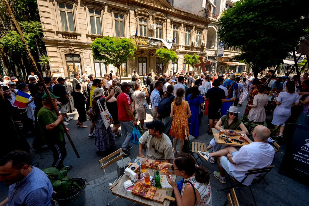 Persoane privesc de pe terasa unui restaurant participanti la o contramanifestatie organizata de asociatia ''Fratia Ortodoxa'' fata de marsul comunitatii LGBTQ+ ''Bucharest Pride 2025ÕÕ, in Bucuresti, duminica, 8 iunie 2025. Aproximativ 100 de persoane purtand cruci, icoane si agheasma au participat, duminica, la un mars de ''izgonire a duhurilor necurate lasate in urma de parada LGBTQ'' conform organizatorilor, pe acelasi traseu ca participantii la Bucharest Pride 2025. ANDREEA ALEXANDRU / MEDIAFAX FOTO