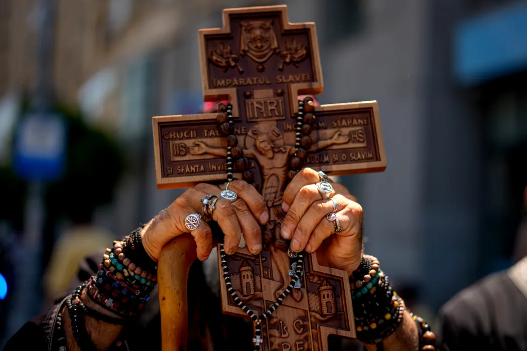 Un barbat ridica o cruce, in timpul unei contramanifestatii organizate de asociatia ''Fratia Ortodoxa'' fata de marsul comunitatii LGBTQ+ ''Bucharest Pride 2025ÕÕ, in Bucuresti, duminica, 8 iunie 2025. Aproximativ 100 de persoane purtand cruci, icoane si agheasma au participat, duminica, la un mars de ''izgonire a duhurilor necurate lasate in urma de parada LGBTQ'' conform organizatorilor, pe acelasi traseu ca participantii la Bucharest Pride 2025. ANDREEA ALEXANDRU / MEDIAFAX FOTO