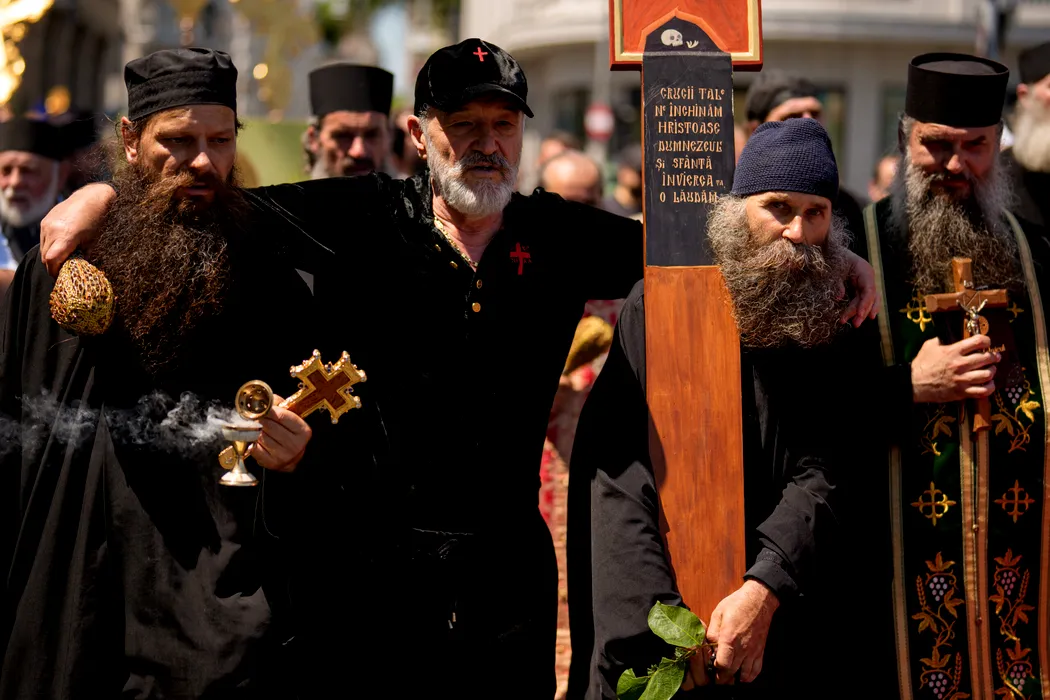 GALERIE FOTO: Gigi Becali, cu crucea pe umăr, a mers să „sfințească” Piața Victoriei: „Contramanifestație față de marșul LGBT Bucharest Pride”