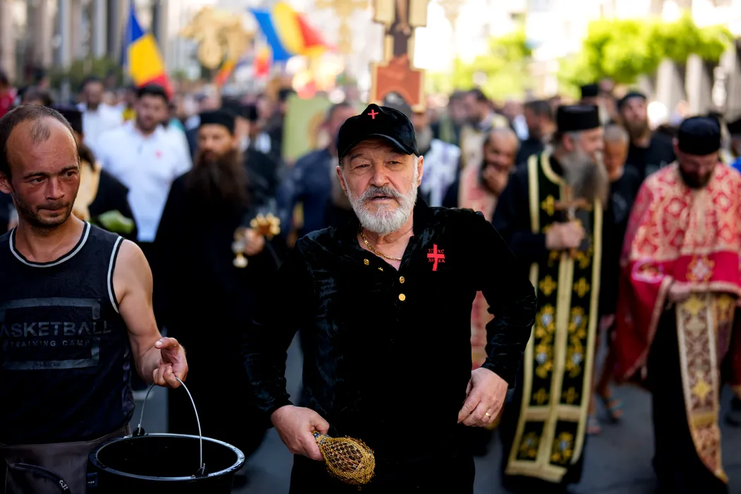 GALERIE FOTO: Gigi Becali, cu crucea pe umăr, a mers să „sfințească” Piața Victoriei: „Contramanifestație față de marșul LGBT Bucharest Pride”