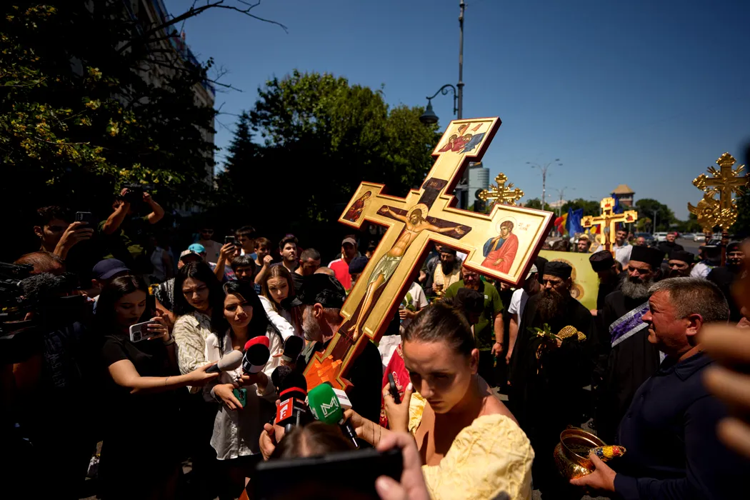 Gigi Becali tine o cruce in timpul unei contramanifestatii organizate de asociatia ''Fratia Ortodoxa'' fata de marsul comunitatii LGBTQ+ ''Bucharest Pride 2025ÕÕ, in Bucuresti, duminica, 8 iunie 2025. Aproximativ 100 de persoane purtand cruci, icoane si agheasma au participat, duminica, la un mars de ''izgonire a duhurilor necurate lasate in urma de parada LGBTQ'' conform organizatorilor, pe acelasi traseu ca participantii la Bucharest Pride 2025. ANDREEA ALEXANDRU / MEDIAFAX FOTO