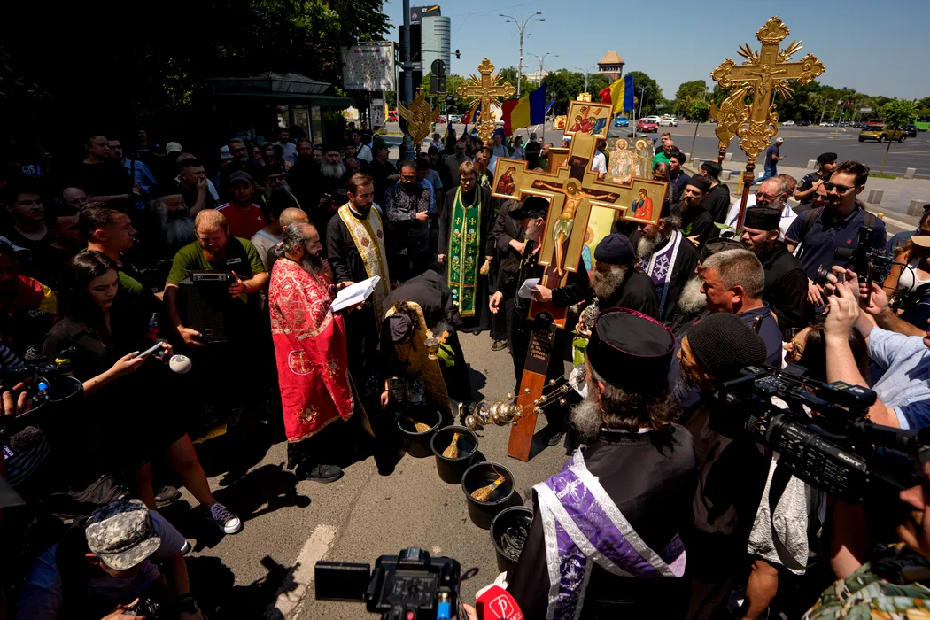 Gigi Becali tine o cruce in timpul unei contramanifestatii organizate de asociatia ''Fratia Ortodoxa'' fata de marsul comunitatii LGBTQ+ ''Bucharest Pride 2025ÕÕ, in Bucuresti, duminica, 8 iunie 2025. Aproximativ 100 de persoane purtand cruci, icoane si agheasma au participat, duminica, la un mars de ''izgonire a duhurilor necurate lasate in urma de parada LGBTQ'' conform organizatorilor, pe acelasi traseu ca participantii la Bucharest Pride 2025. ANDREEA ALEXANDRU / MEDIAFAX FOTO