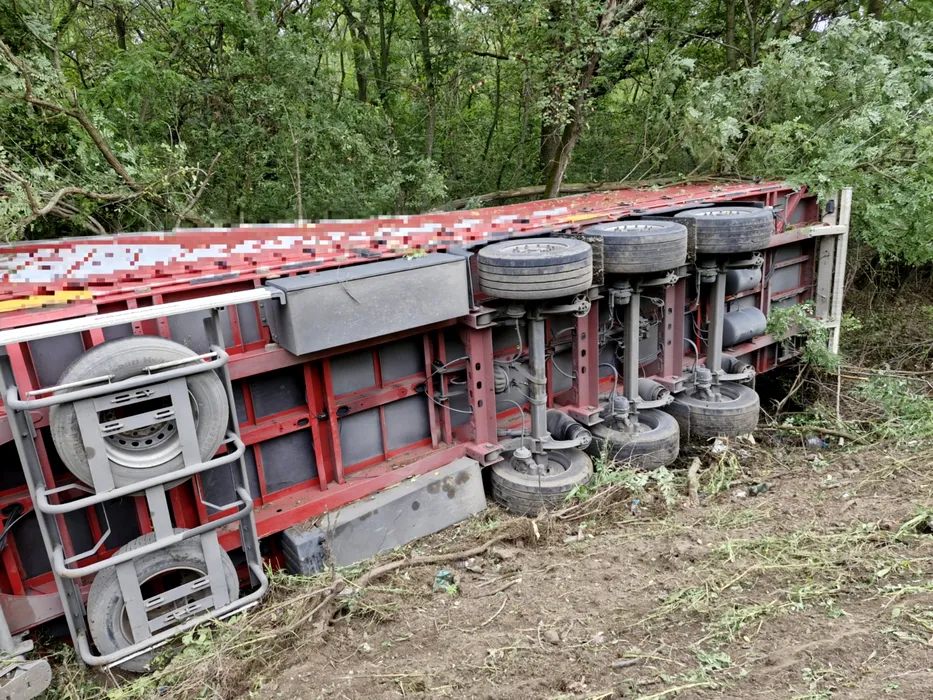 GIURGIU: Autotren încărcat cu radiatoare, răsturnat pe DN5B. Scurgeri de carburant pe drum